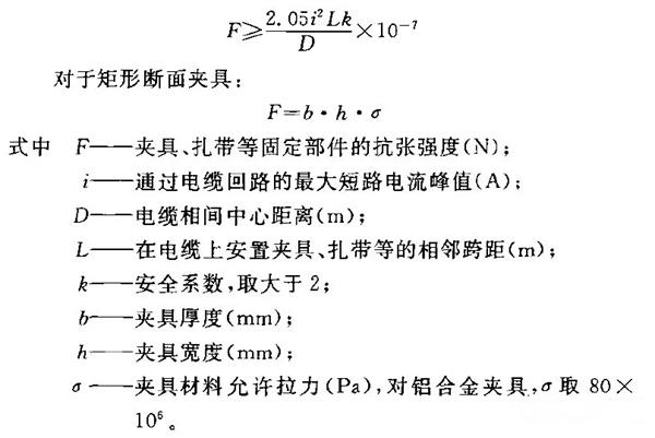 電纜固定夾具應(yīng)具有表面平滑、便于安裝、足夠的機(jī)械強(qiáng)度和適合使用環(huán)境的耐久性(防腐蝕、耐熱、耐寒、防水、阻燃 )。交流單芯電力電纜固定部件的機(jī)械強(qiáng)度,應(yīng)驗(yàn)算短路電動(dòng)力條件, 并宜滿足下列公式: