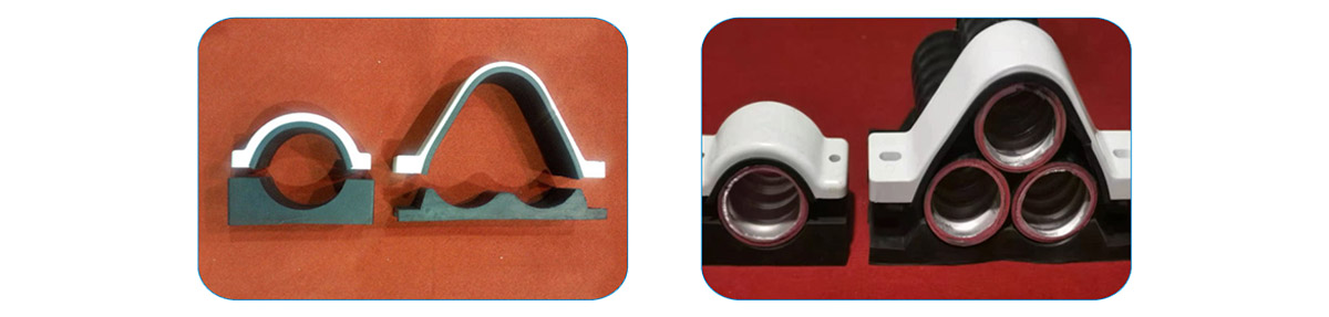 電纜固定夾具材質(zhì)選擇,除交流單芯電力電纜外,可采用經(jīng)防腐處理的金屬夾具,但電纜與金屬夾具之間宜設(shè)置絕緣襯墊;交流單芯電力電纜的固定夾具,宜采用鋁合金等不構(gòu)成磁性閉合回路的夾具。常用的有鋁合金固定夾具和復(fù)合材料(不飽和聚酯模塑料)固定夾具。單芯電纜一般采用防渦流夾具 。