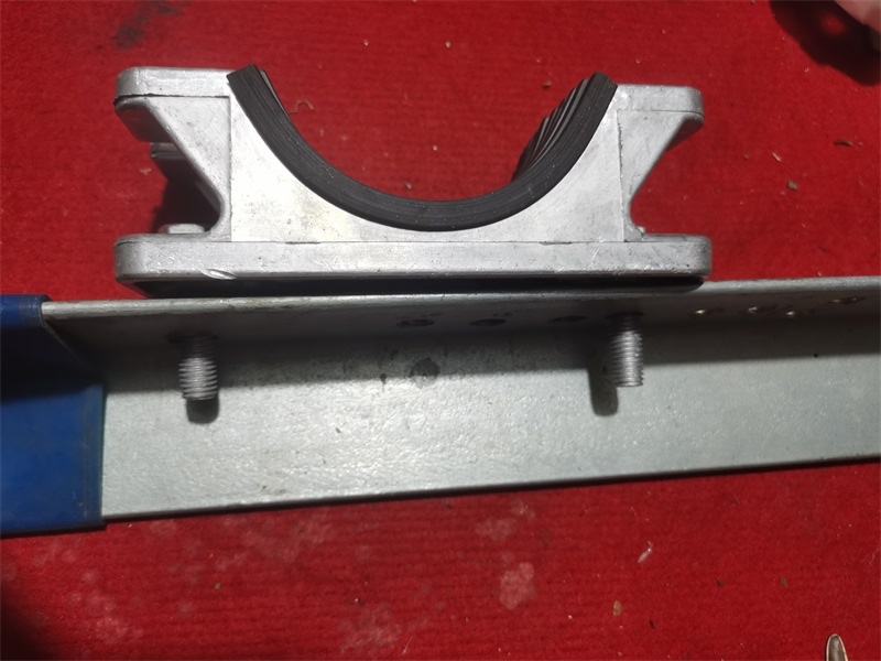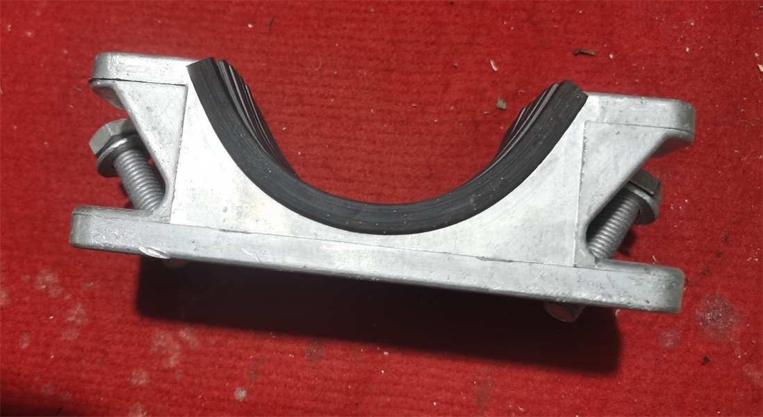 它的主要優(yōu)點一是加寬加長加重。以JD-90/105型為例:長180毫米,寬80毫米,高140毫米重1.6公斤以上。二是底座可以單獨用兩條螺栓固定到鐵塔或隧道內(nèi)電纜支架上面,另外兩條螺栓可以將電纜單獨固定到夾具上蓋和底座之間,這種結(jié)構(gòu)可以有效增加電纜夾具的穩(wěn)定性和可靠性。此夾具的正面和側(cè)面照片如下: